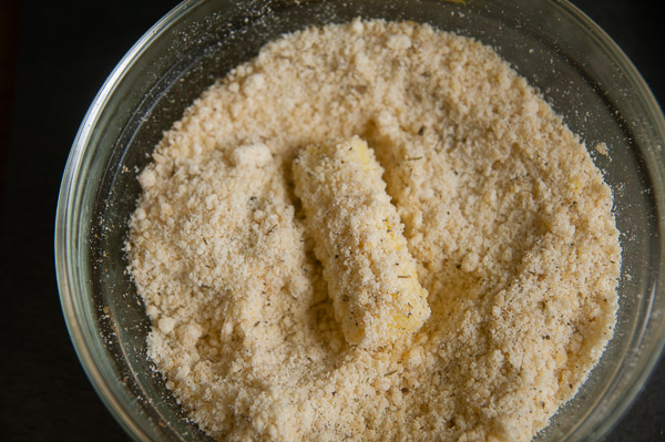 When the cookie sheets are prepared, start dipping the mozzarella pieces. I experimented with dipping and found the best breading success by rolling a mozzarella stick in the Parmesan cheese first. Then I dip that piece in the beaten egg. Then, I rolled the double dipped cheese stick in the Parmesan mixture until it is well coated. Repeat this until all are coated. Place them on the cookie sheet leaving a few inches between each piece.