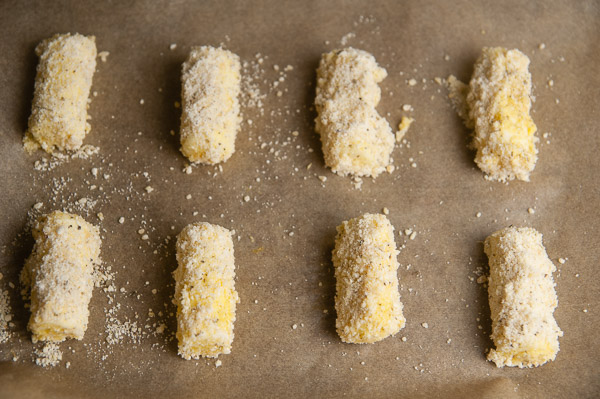 - Dip your cut mozzarella piece into the Parmesan mixture first, then into the egg, and then again into the Parmesan. Place the dipped mozzarella stick onto a baking sheet lined with parchment paper. Repeat until you've dipped all the mozzarella pieces. Put the baking sheets into the freezer for an hour.